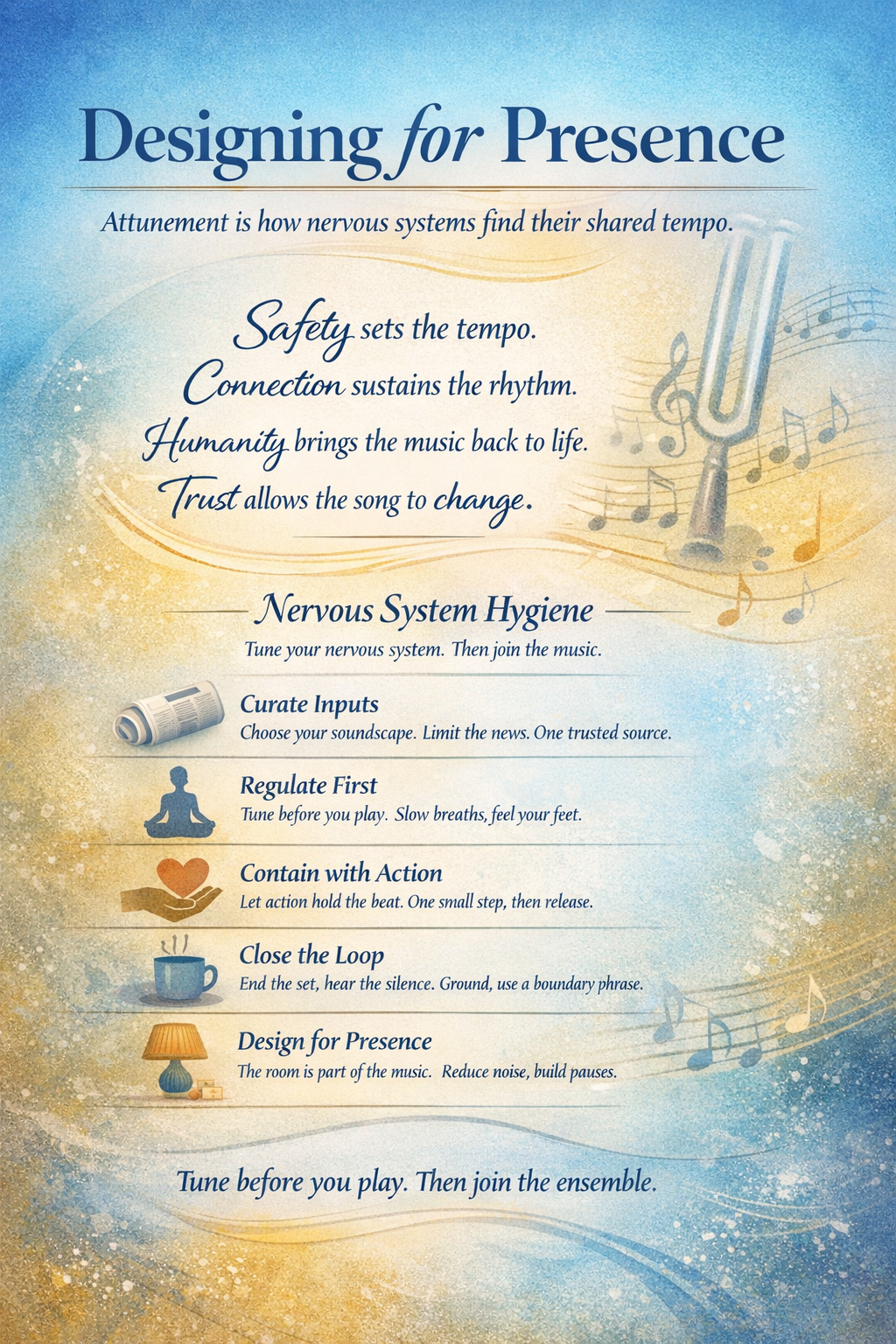 Attunement to tone, rhythm, pacing, timbre, and embodied presence are foundational musical competencies—and they are also nervous-system skills. These aren’t artistic flourishes. They are relational stepping stones to safety, trust, and engagement across any human system.